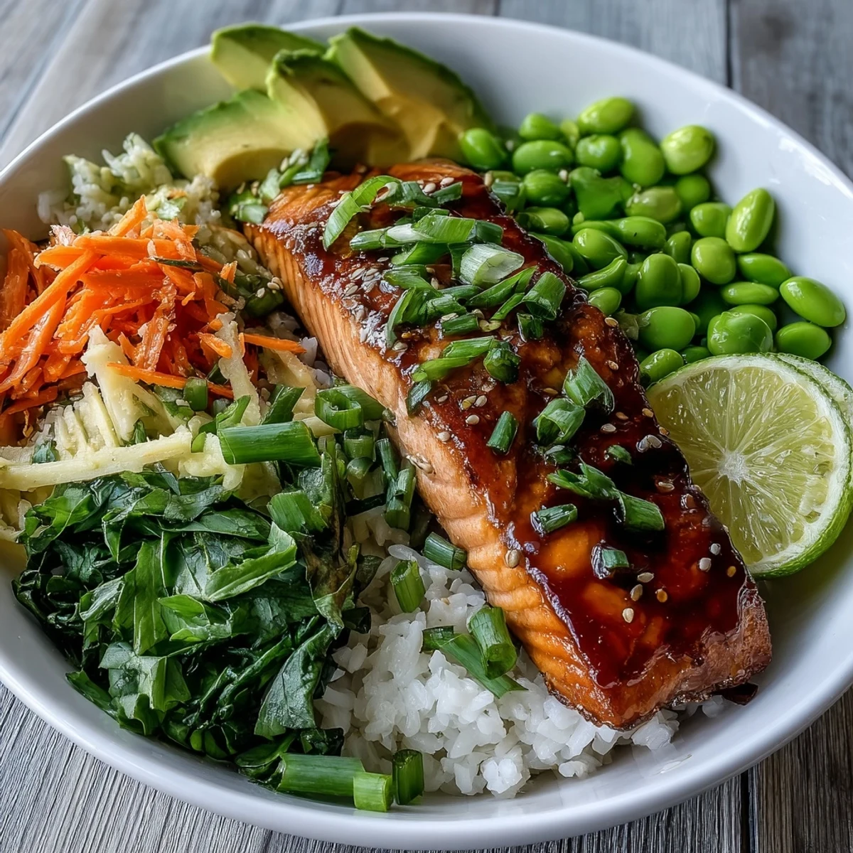 Save A vibrant and healthy bowl featuring tender soy-ginger glazed salmon fillets served atop steamed rice and crisp Asian vegetables. Perfect for a quick, flavorful meal that brings together the aromatic notes of fresh ginger and garlic with the rich texture of perfectly seared salmon.